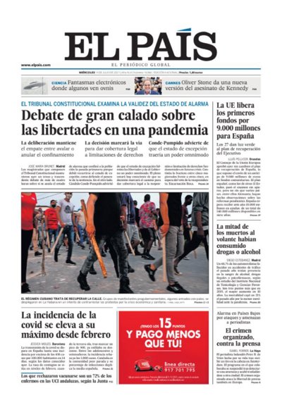EL PAÍS: "Debate de gran calado sobre las libertades en una pandemia"; "La UE libera los primeros fondos por 9.000 millones para España"; "La mitad de los muertos al volante habían consumido drogas o alcohol"; "La incidencia de la covid se eleva a su máximo desde febrero"; "La mitad de los muertos al volante habían consumido drogas o alcohol"; "El crimen organizado, contra la prensa".