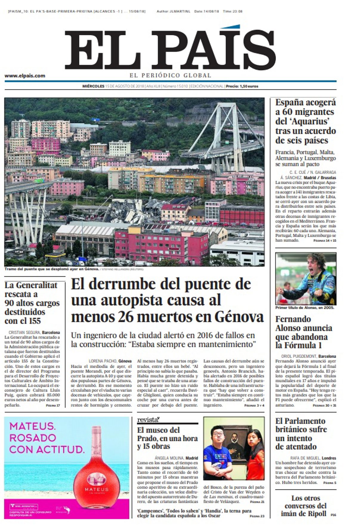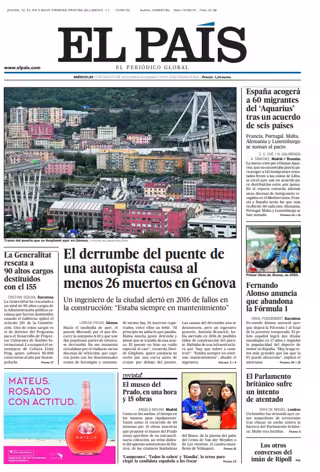 EL PAÍS: "España acogerá a 60 migrantes del 'Aquarius' tras un acuerdo de seis países"; "El derrumbe del puente de una autopista causa al menos 26 muertos en Génova"; "La Generalitat rescata a 90 altos cargos destituidos con el 155"; "Fernando Alonso anuncia que abandona la Fórmula 1".