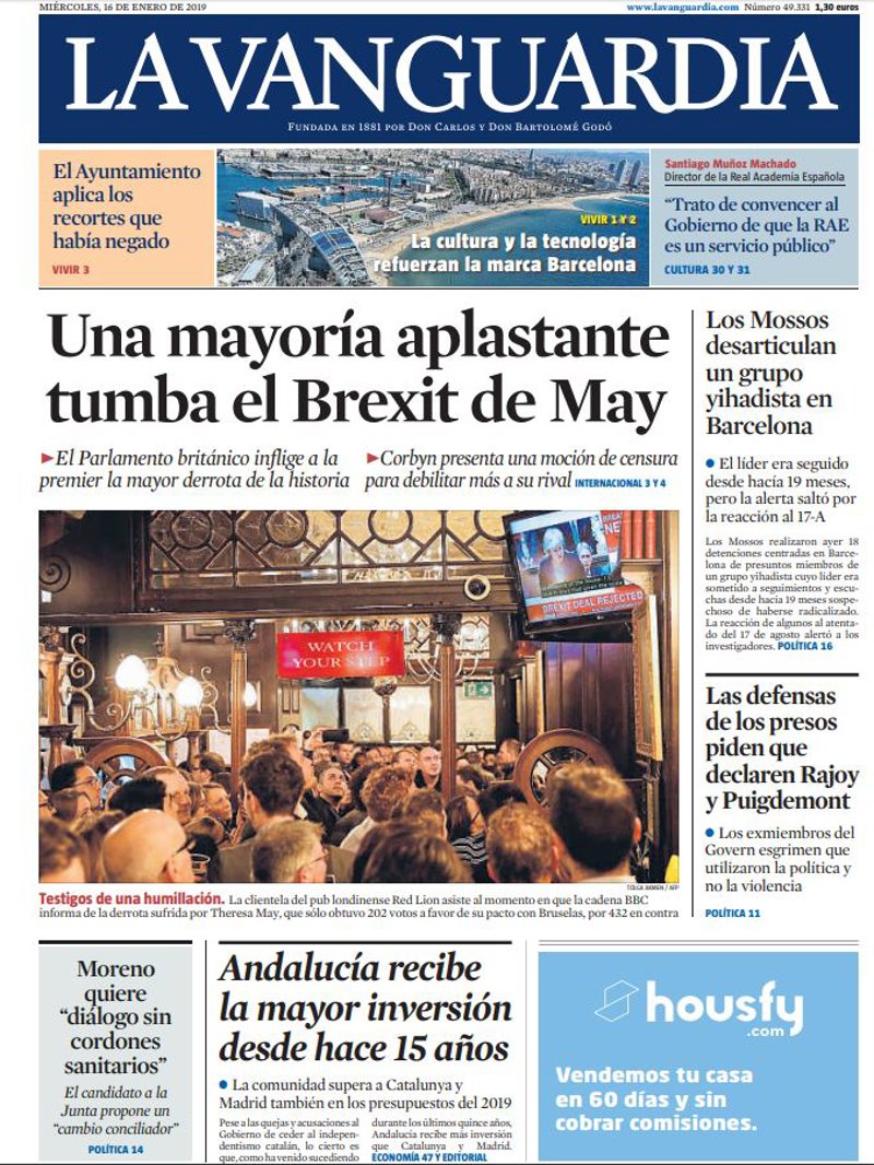 LA VANGUARDIA: "Una mayoría aplastante tumba el Brexit de May"; "Los Mossos desarticulan un grupo yihadista en Barcelona"; "Las defensas de los presos piden que declaren Rajoy y Puigdemont"; "Andalucía recibe la mayor inversión desde hace 15 años"; "Moreno quiere "diálogo sin cordones sanitarios"".