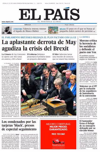 EL PAÍS: "La aplastante derrota de May agudiza la crisis del Brexit"; "Moreno critica la herencia de los socialistas y defiende el pacto con Vox"; "Malestar en el PP por la exclusión de los seguidores de Santamaría de la convención"; "Los condenados por lastarjetas 'black', presos de especial seguimiento"; "El Santander frena el fichaje de su consejero delegado por su elevado bonus".