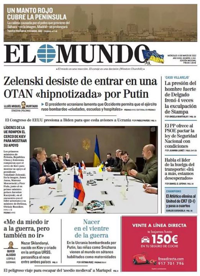 EL MUNDO: "Zelenski desiste de entrar en una OTAN "hipnotizada" por Putin"; ""Me da miedo ir a la guerra, pero también no ir""; "La presión del hombre fuerte de Delgado frenó 4 veces la exculpación de Stampa"; "El PP ofrece al PSOE pactarla ley de Seguridad Nacional con condiciones"; "Habla el líder de la huelga de transporte: "Irá a más, estamos desesperados"".