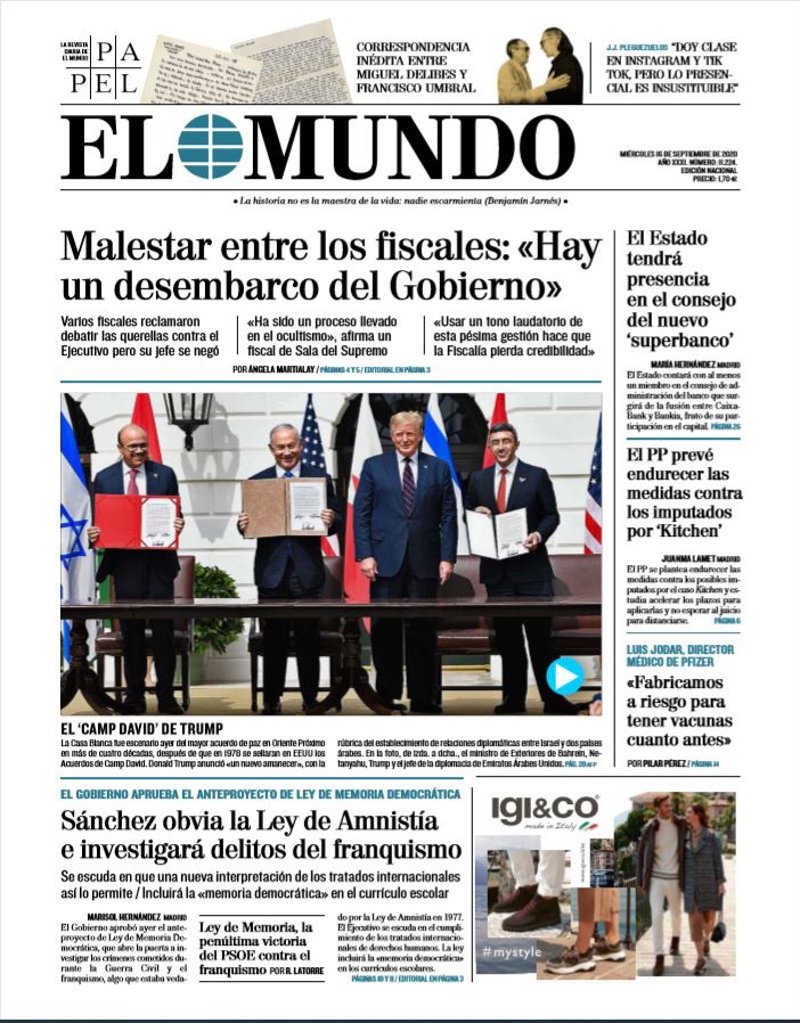 EL MUNDO: "Malestar entre los fiscales: "Hay un desembarco del Gobierno""; "El 'Camp David' de Trump. La Casa Blanca fue escenario ayer del mayor acuerdo de paz en Oriente Próximo en más de cuatro décadas, después de que en 1978 se sellaran en EEUU los Acuerdos de Camp David"; "Sánchez obvia la Ley de Amnistía e investigará delitos del franquismo. Ley de Memoria, la penúltima victoria del PSOE contra el franquismo"; "El Estado tendrá presencia en el consejo del nuevo 'superbanco'"; "El PP prevé endurecer las medidas contra los imputados por 'Kitchen'"; "Luis Jodar, director médico de Pfizer: "Fabricamos a riesgo para tener vacunas cuanto antes"".