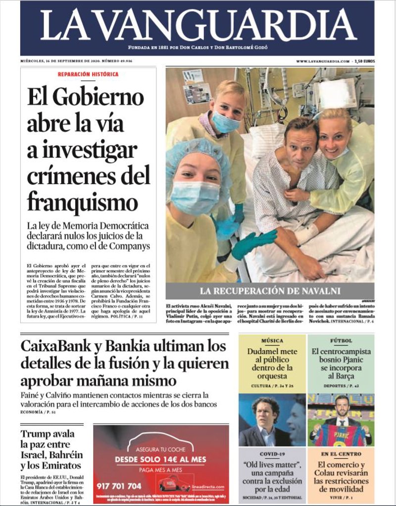 LA VANGUARDIA: "El Gobierno abre la vía a investigar crímenes del franquismo"; "La recuperación de Navalni"; "CaixaBank y Bankia ultiman los detalles de la fusión y la quieren aprobar mañana mismo"; "Trump avala la paz entre Israel, Bahréin y los Emiratos".