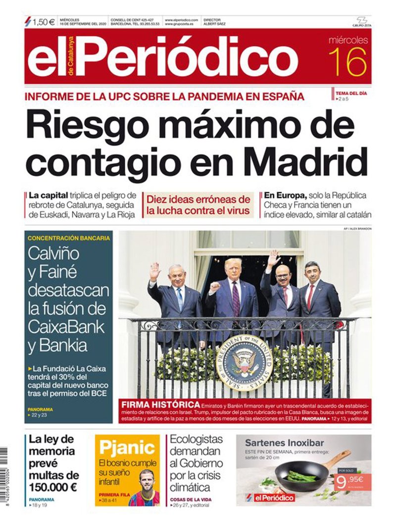 EL PERIÓDICO: "Riesgo máximo de contagio en Madrid. Diez ideas erróneas de la lucha contra el virus"; "Firma histórica. Emiratos y Baréin firmaron ayer un trascendental acuerdo de establecimiento de relaciones con Israel"; "Calviño y Fainé desatascan la fusión de CaixaBank y Bankia"; "La ley de memoria prevé multas de 150.000 €"; "Pjanic. El bosnio cumple su sueño infantil"; "Ecologistas demandan al Gobierno por la crisis climática".