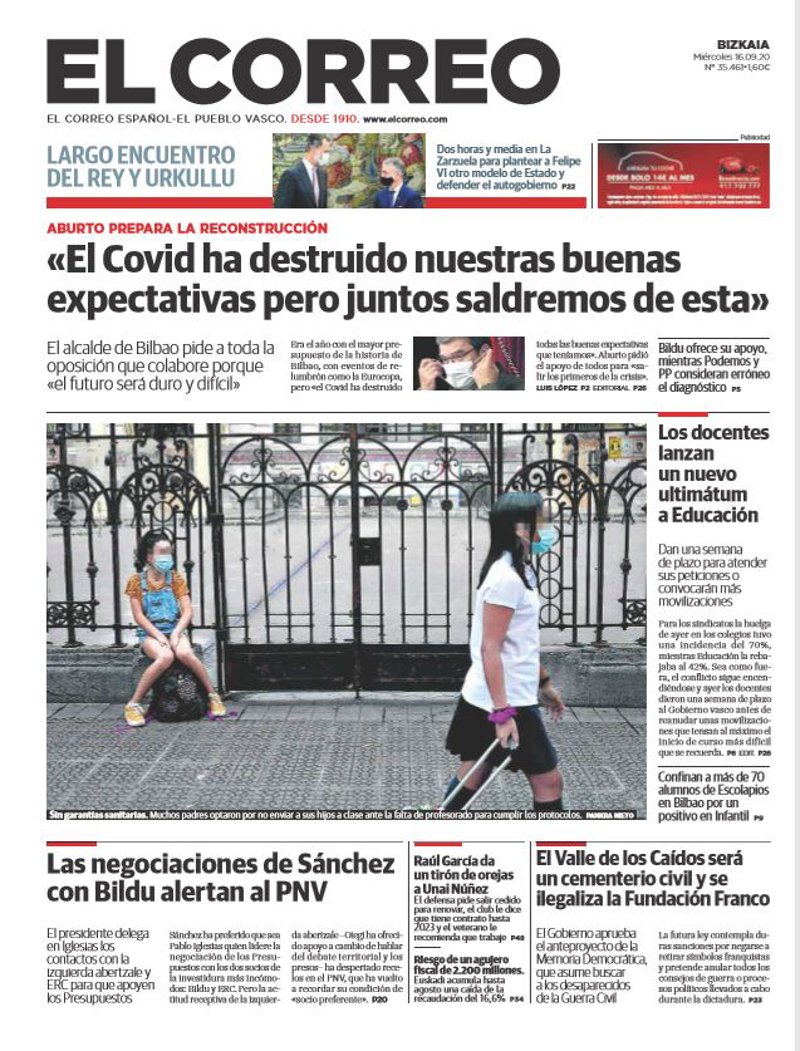 EL CORREO: "Aburto prepara la reconstrucción. "El Covid ha destruido nuestras buenas expectativas pero juntos saldremos de esta""; "Los docentes lanzan un nuevo ultimátum a Educación"; "Las negociaciones de Sánchez con Bildu alertan al PNV"; "El Valle de los Caídos será un cementerio civil y se ilegaliza la Fundación Franco".