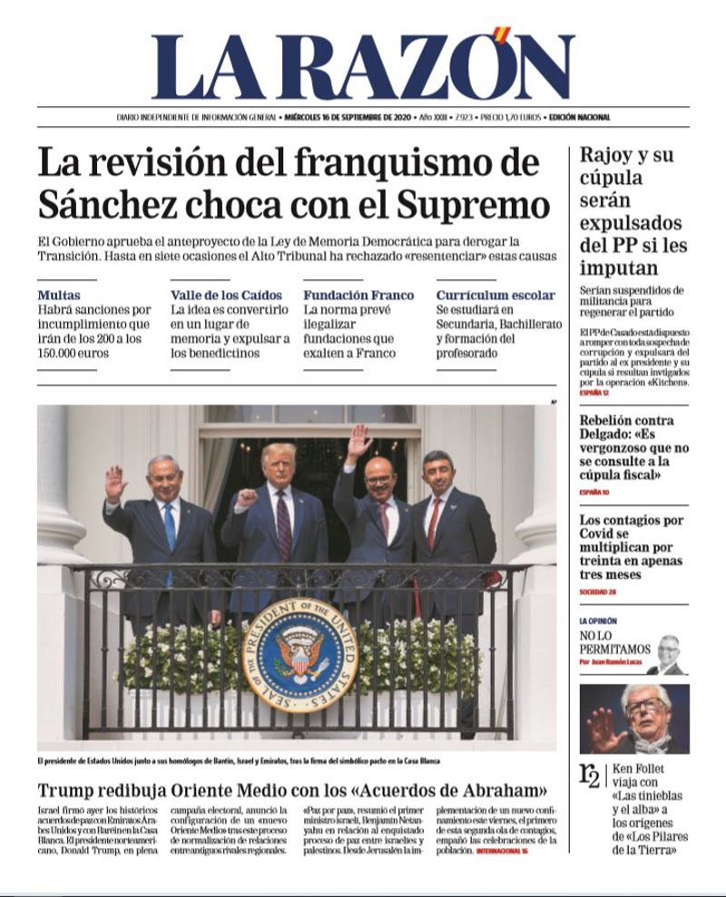 LA RAZÓN: "La revisión del franquismo de Sánchez choca con el Supremo"; "Trump redibuja Oriente Medio con los "Acuerdos de Abraham""; "Rajoy y su cúpula serán expulsados del PP si les imputan"; "Rebelión contra Delgado: "Es vergonzoso que no se consulte a la cúpula fiscal""; "Los contagios por Covid se multiplican por treinta en apenas tres meses"; "Ken Follet viaja con "Las tinieblas y el alba" a los orígenes de "Los Pilares de la Tierra"".