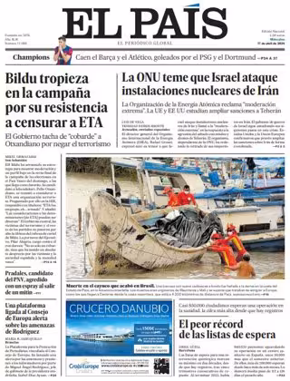EL PAÍS: "Bildu tropieza en la campaña por su resistencia a censurar a ETA"; "La ONU teme que Israel ataque instalaciones nucleares de Irán"; "Pradales, candidato del PNV, agredido con un espray al salir de un mitin"; "Una plataforma ligada al Consejo de Europa alerta sobre las amenazas de Rodríguez"; "El peor récord de las listas de espera".