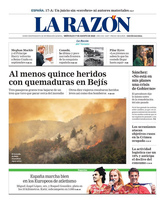 LA RAZÓN: "Al menos quince heridos con quemaduras en Bejís"; "Sánchez: No está en mis planes una crisis de Gobierno"; "Los ucranianos atacan objetivos rusos en la Crimea ocupada"; "La actividad logística cae un 16% y anticipa el declive del consumo"; "España marcha bien en los Europeos de atletismo".