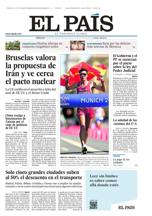 EL PAÍS: "Bruselas valora la propuesta de Irán y ve cerca el pacto nuclear"; "China castiga a funcionarios de Taiwán por el viaje de políticos de EE UU"; "El Gobierno y el PP se enzarzan por el pacto sobre la ley del Poder Judicial"; "La soledad de las víctimas del 17-A"; "Solo cinco grandes ciudades suben al 50% el descuento en el transporte".