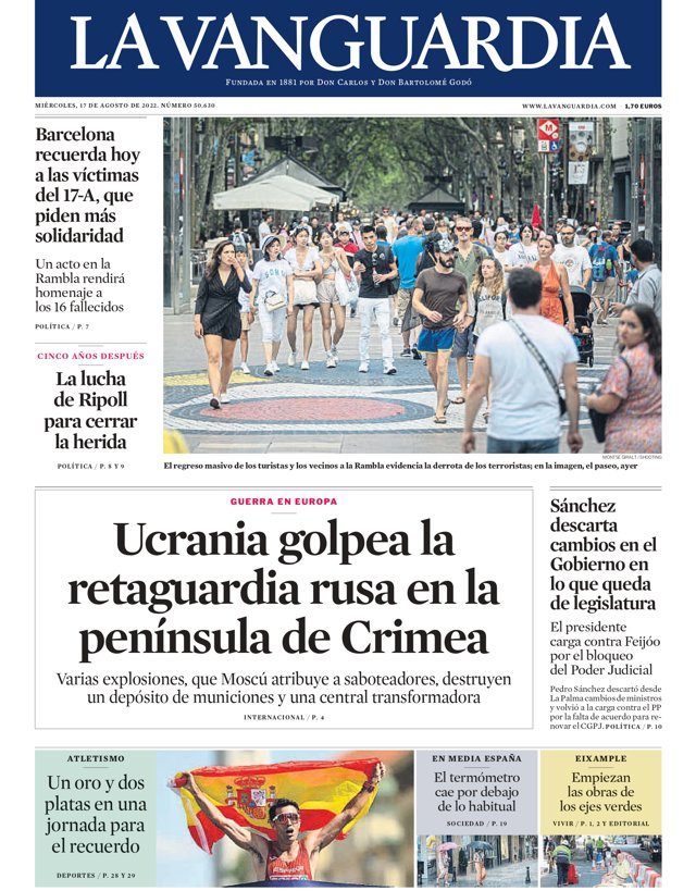 LA VANGUARDIA: "Barcelona recuerda hoy a las víctimas del 17-A, que piden más solidaridad"; "La lucha de Ripoll para cerrar la herida"; "Ucrania golpea la retaguardia rusa en la península de Crimea"; "Sánchez descarta cambios en el Gobierno en lo que queda de legislatura"; "Un oro y dos platas en una jornada para el recuerdo"; "El termómetro cae por debajo de lo habitual".