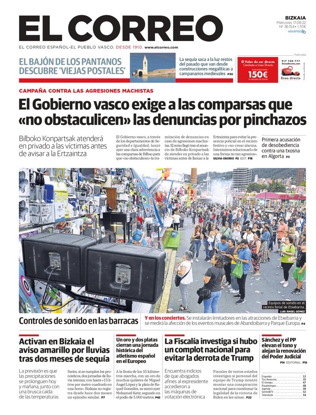 aviso amarillo por lluvias tras dos meses de sequía"; "Un oro y dos platas cierran una jornada histórica del atletismo español en el Europeo"; "La Fiscalía investiga si hubo un complot nacional para evitar la derrota de Trump".