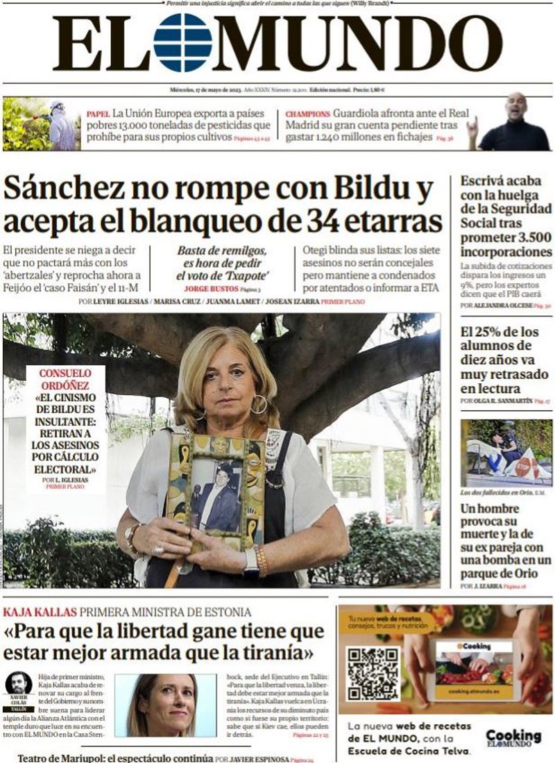 EL MUNDO: "Sánchez no rompe con Bildu y acepta el blanqueo de 34 etarras"; "Kaja Kallas: "Para que la libertad gane tiene que estar mejor armada""; "Escrivá acaba con la huelga de la Seguridad Social tras prometer 3.500 incorporaciones"; "El 25% de los alumnos de diez años va muy retrasado en lectura"; "Un hombre provoca su muerte y la de su ex pareja con una bomba en un parque de Orio".