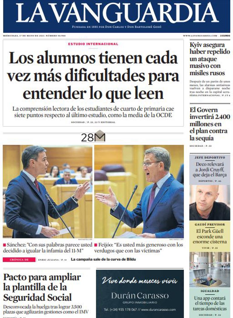LA VANGUARDIA: "Los alumnos tienen cada vez más dificultades para entender lo que leen"; "Pacto para ampliar la plantilla de la Seguridad Social"; "Kyiv asegura haber repelido un ataque masivo con misiles rusos"; "El Govern invertirá 2.400 millones en el plan contra la sequía".