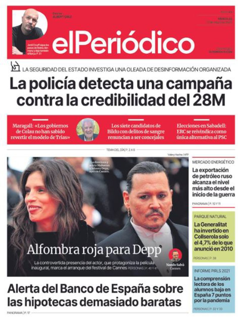 EL PERIÓDICO: "La policía detecta una campaña contra la credibilidad del 28M"; "Alfombra roja para Depp"; "Alerta del Banco de España sobre las hipotecas demasiado baratas"; "La exportación de petróleo ruso alcanza el nivel más alto desde el inicio de la guerra"; "La Generalitat ha invertido en Collserola solo el 4,7% de lo que anunció en 2010"; "La comprensión lectora de los alumnos baja en España 7 puntos por la pandemia".