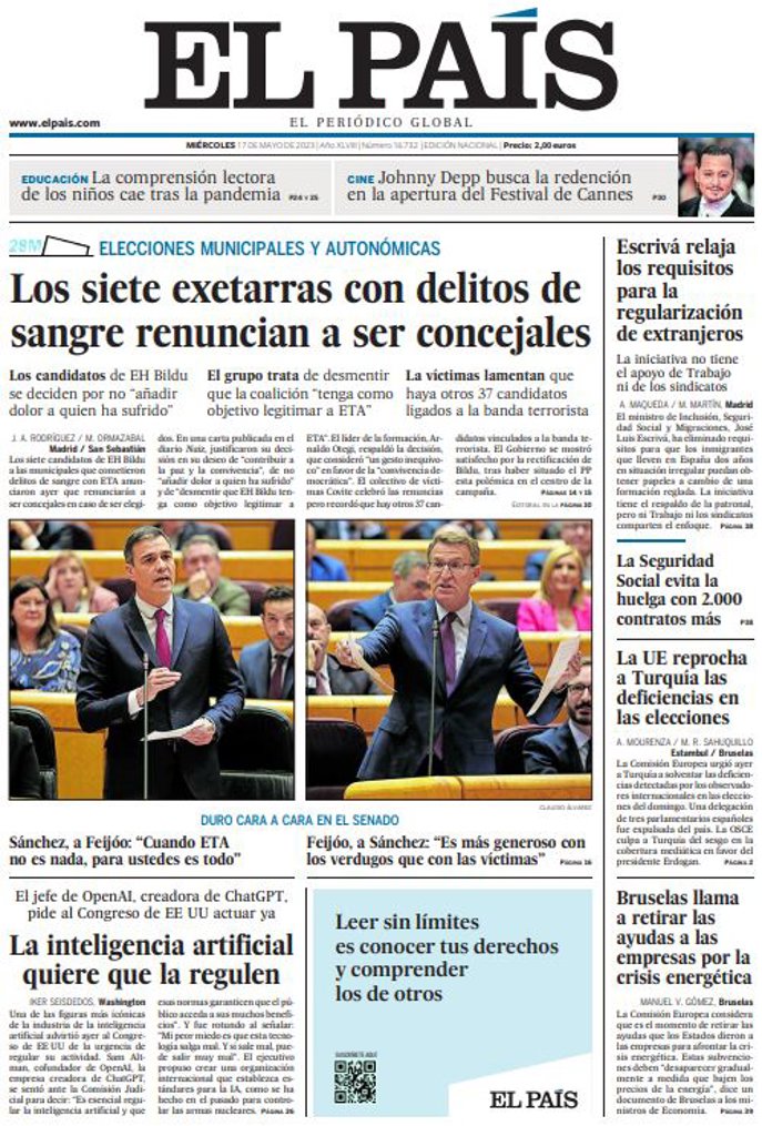EL PAÍS: "Los siete exetarras con delitos de sangre renuncian a ser concejales"; "La inteligencia artificial quiere que la regulen"; "Escrivá relaja los requisitos para la regularización de extranjeros"; "La Seguridad Social evita la huelga con 2.000 contratos más"; "La UE reprocha a Turquía las deficiencias en las elecciones"; "Bruselas llama a retirar las ayudas a las empresas por la crisis energética".