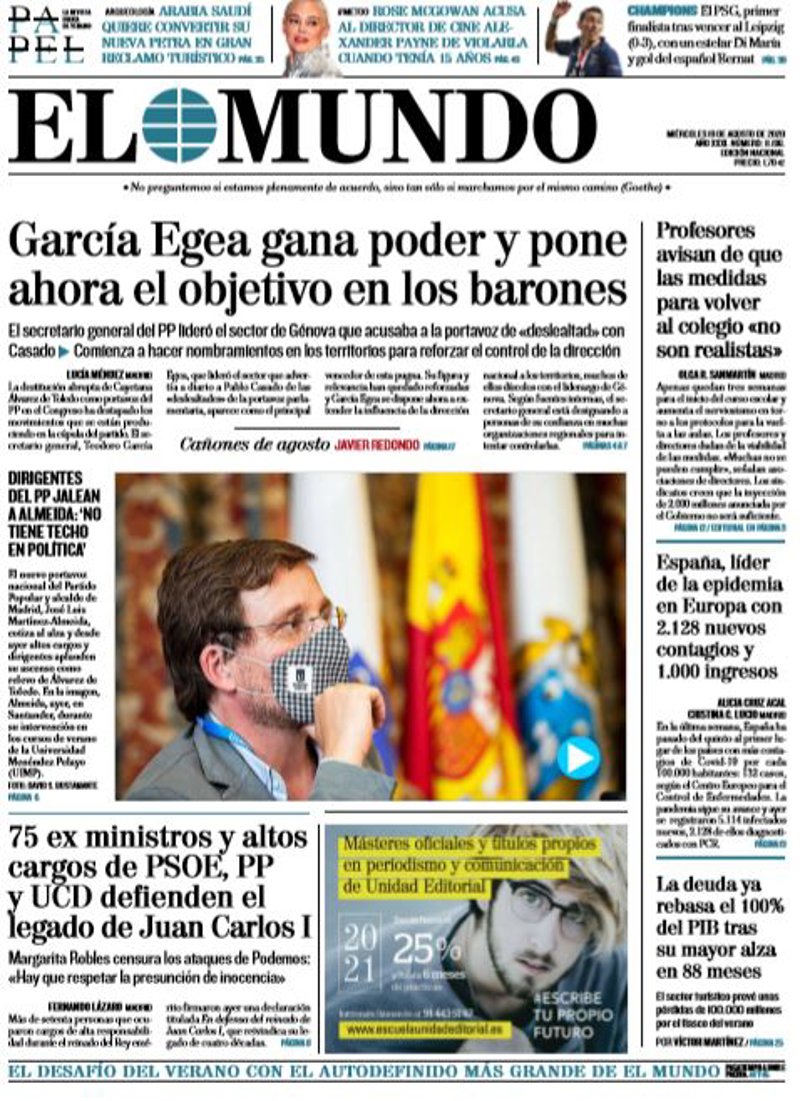 EL MUNDO: "García Egea gana poder y pone ahora el objetivo en los barones"; "Dirigentes del PP jalean a Almeida: 'No tiene techo en política'"; "75 ex ministros y altos cargos de PSOE, PP y UCD defienden el legado de Juan Carlos"; "Profesores avisan de que las medidas para volver al colegio "no son realistas""; "España, líder de la epidemia en Europa con 2.128 nuevos contagios y 1.000 ingresos"; "La deuda ya rebasa el 100% del PIB tras su mayor alza en 88 meses".