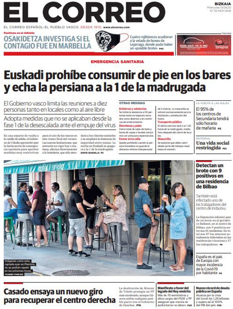 EL CORREO: "Euskadi prohíbe consumir de pie en los bares y echa la persiana a la 1 de la madrugada"; "Casado ensaya un nuevo giro para recuperar el centro derecha"; "Detectan un brote con 9 positivos en una residencia de Bilbao"; "Manifiesto a favor del legado del Rey emérito"; "Nuevo récord de deuda pública en España".