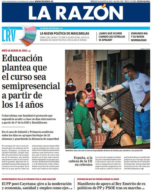 LA RAZÓN: "Educación plantea que el curso sea semipresencial a partir de los 14 años"; "El PP post-Cayetana: giro a la moderación y economía, sanidad y empleo como ejes"; "Manifiesto de apoyo al Rey Emérito de ex políticos de PP y PSOE tras su marcha"; "España, a la cabeza de la UE en rebrotes".