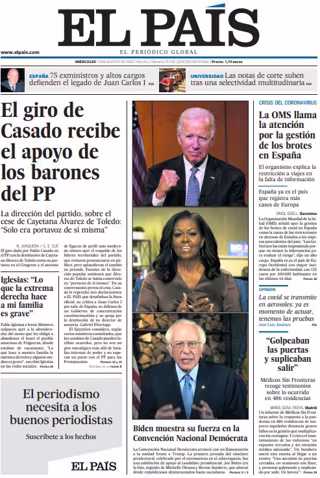 EL PAÍS: "El giro de Casado recibe el apoyo de los barones del PP"; "Iglesias: "Lo que la extrema derecha hace a mi familia es grave""; "Biden muestra su fuerza en la Convención Nacional Demócrata"; "La OMS llama la atención por la gestión de los brotes en España"; "Golpeaban las puertas y suplicaban salir". Médicos Sin Fronteras recoge testimonios sobre lo ocurrido en 486 residencias".