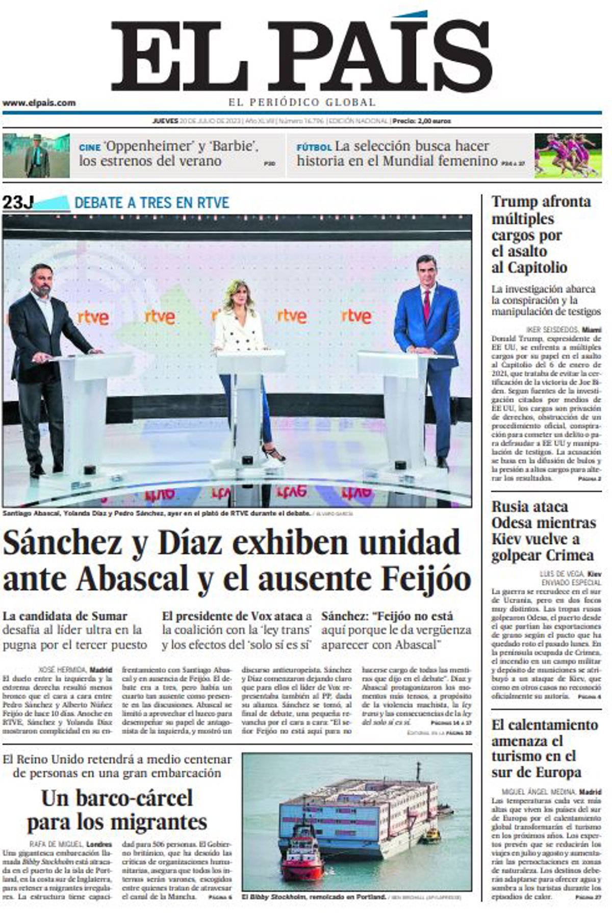 EL PAÍS: "Sánchez y Díaz exhiben unidad ante Abascal y el ausente Feijóo"; "Un barco-cárcel para los migrantes"; "Trump afronta múltiples cargos por el asalto al Capitolio"; "Rusia ataca Odesa mientras Kiev vuelve a golpear Crimea"; "El calentamiento amenaza el