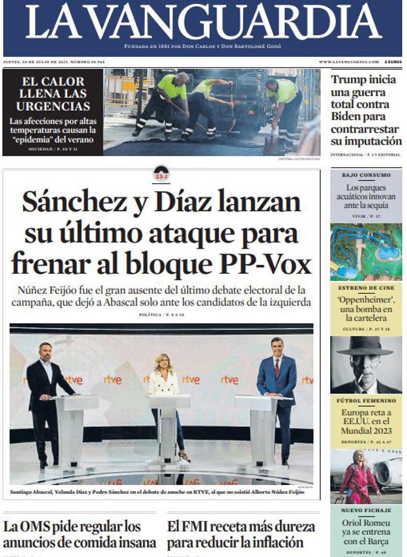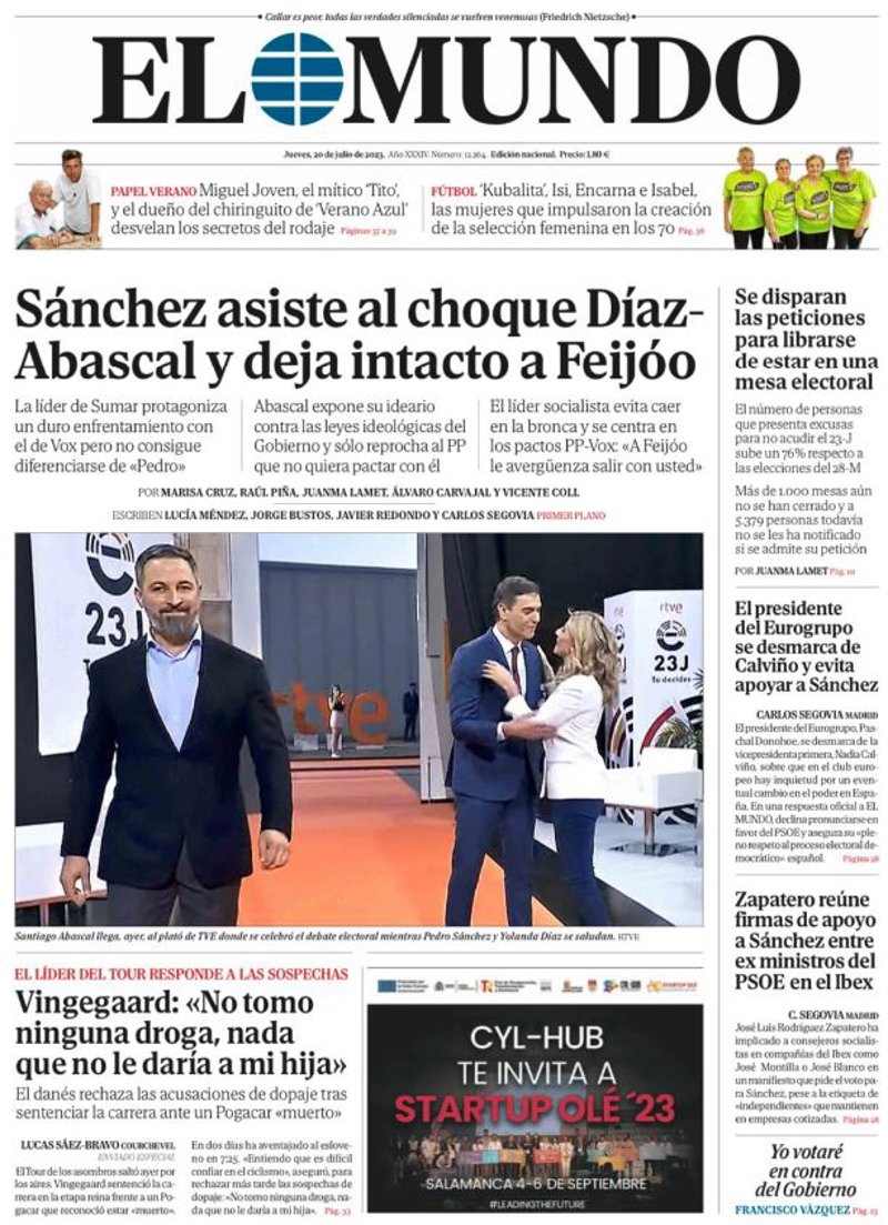 EL MUNDO: "Sánchez asiste al choque Díaz-Abascal y deja intacto a Feijóo"; "Vingegaard: "No tomo ninguna droga, nada que no le daría mi hija""; "Se disparan las peticiones para librarse de estar en una mesa electoral"; "El presidente del Eurogrupo se desmarca de Calviño y evita apoyar a Sánchez"; "Zapatero reúne firmas de apoyo a Sánchez entre ex ministros del PSOE en el Ibex".