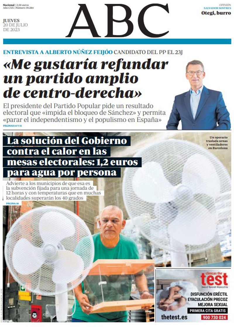 ABC: "Entrevista Alberto Núñez Feijóo: "Me gustaría refundar un partido amplio de centro-derecha""; "La solución del Gobierno contra el calor en las mesas electorales: 1,2 euros para agua por persona".