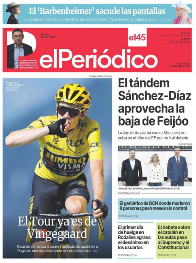 EL PERIÓDICO: "El Tour ya es de Vingegaard"; "El tándem Sánchez-Díaz aprovecha la baja de Feijóo"; "El geriátrico de BCN donde murieron 8 personas pasó meses sin control"; "El primer día de huelga en Rodalíes agrava el desánimo en los usuarios"; "El debate sobre el catalán en las aulas pasa al Supremo y al Constitucional"
