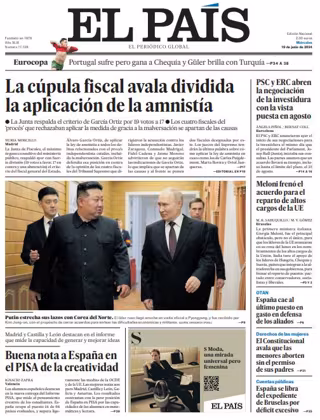 EL PAÍS: "La cúpula fiscal avala dividida la aplicación de la amnistía"; "Buena nota a España en el PISA de la creatividad"; "PSC y ERC abren la negociación de la investidura con la vista puesta en agosto"; "Meloni frenó el acuerdo para el reparto de altos cargos de la UE"; "España cae al último puesto en gasto en defensa de los aliados"; "El Constitucional avala que las menores aborten sin el permiso de sus padres"; "España se libra del expediente de Bruselas por déficit excesivo".