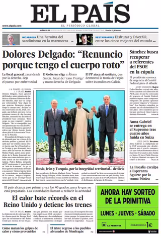 EL PAÍS: "Dolores Delgado: "Renuncio porque tengo el cuerpo roto""; "El calor bate récords en el Reino Unido y detiene los trenes"; "Sánchez busca recuperar a referentes del PSOE en la cúpula"; "Anna Gabriel se entrega en el Supremo tras cuatro años