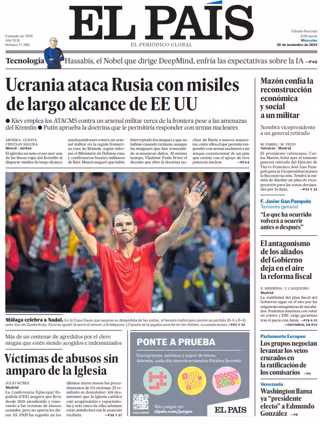 EL PAÍS: "Ucrania ataca Rusia con misiles de largo alcance de EE UU"; "Víctimas de abusos sin amparo de la Iglesia"; "Mazón confía la reconstrucción económica y social a un militar"; "El antagonismo de los aliados del Gobierno deja en el aire la reforma fiscal"; "Los grupos negocian levantar los vetos cruzados en la ratificación de los comisarios"; "Washington llama ya "presidente electo" a Edmundo González".