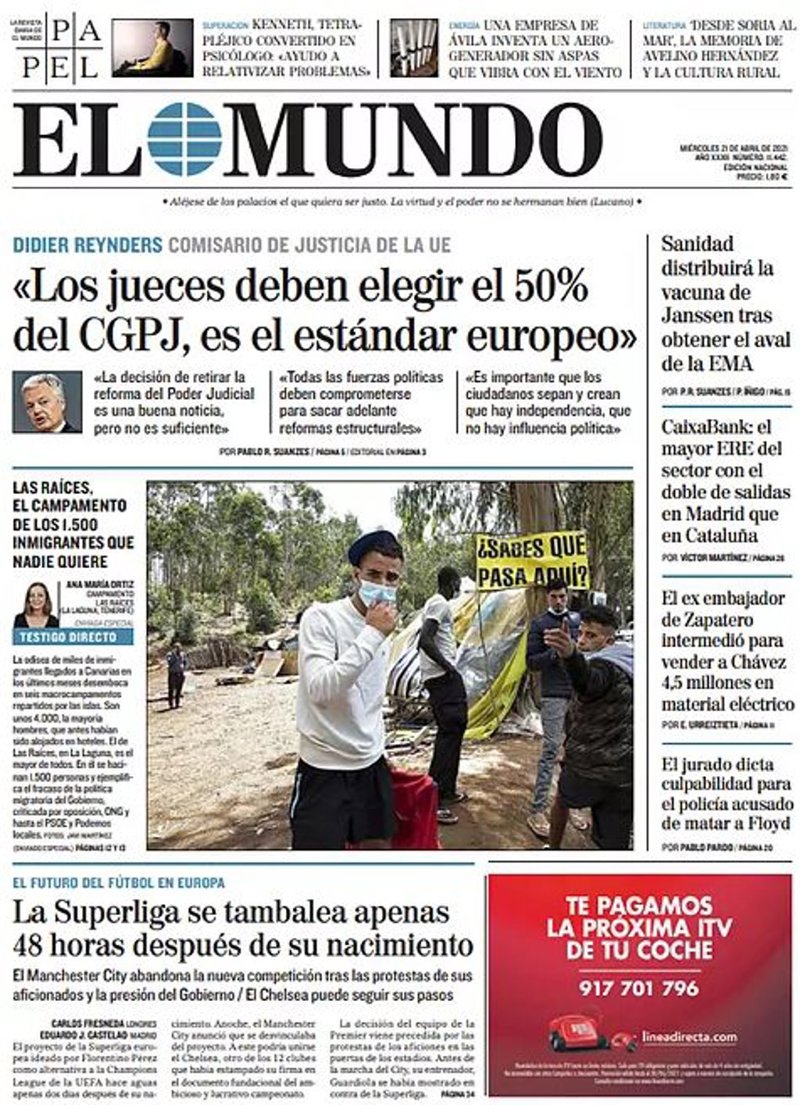 EL MUNDO: "Didier Reynders, comisario de Justicia de la UE: "Los jueces deben elegir el 50% del CGPJ, es el estándar europeo""; "La Superliga se tambalea apenas 48 horas después de su nacimiento"; "Sanidad distribuirá la vacuna de Janssen tras obtener el aval de la EMA"; "CaixaBank: el mayor ERE del sector con el doble de salidas en Madrid que en Cataluña"; "El ex embajador de Zapatero intermedió para vender a Chávez 4,5 millones en material eléctrico"; "El jurado dicta culpabilidad para el policía acusado de matar a Floyd".