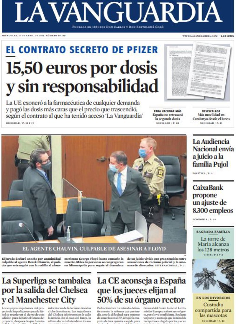 LA VANGUARDIA: "El contrato secreto de Pfizer. 15,50 euros por dosis y sin responsabilidad"; "La Superliga se tambalea por la salida del Chelsea y el Manchester City"; "La CE aconseja a España que los jueces elijan al 50% de su órgano rector"; "La Audiencia Nacional envía a juicio a la familia Pujol"; "CaixaBank propone un ajuste de