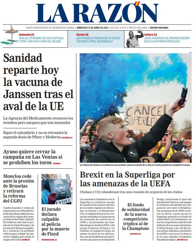 LA RAZÓN: "Sanidad reparte hoy la vacuna de Janssen tras el aval de la UE"; "Ayuso quiere cerrar la campaña en Las Ventas si se prohíben los toros"; "Moncloa cede ante la presión de Bruselas y retirará la reforma del CGPJ"; "El jurado declara culpable al policía por la muerte de Floyd"; "Brexit en la Superliga por las amenazas de la UEFA"; "El fondo de solidaridad de la nueva competición triplica al de la Champions".