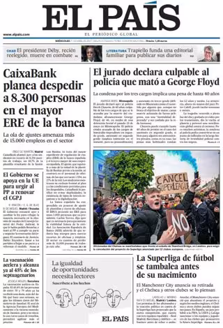 ERE de la banca"; "El jurado declara culpable al policía que mató a George Floyd"; "El Gobierno se apoya en la UE para urgir al PP a renovar el CGPJ"; "La vacunación acelera y alcanza ya al 45% de los septuagenarios"; "La Superliga de fútbol se tambalea antes de su nacimiento. El Manchester City anuncia su retirada y el Chelsea y otros clubes se lo piensan".