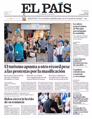 EL PAÍS: "El turismo apunta a otro récord pese a las protestas por la masificación"; "Biden cierra la herida de su renuncia"; "Los ultras usan el crimen de Mocejón para propagar la xenofobia"; "La investigación evalúa si el detenido tiene una discapacidad"; "Un policía retirado mata a su pareja y a su exmujer"; "Un error de Igualdad facilita el despido por pedir o tener adaptación de jornada"; "Ucrania abre un segundo flanco de ataque en territorio de Rusia".