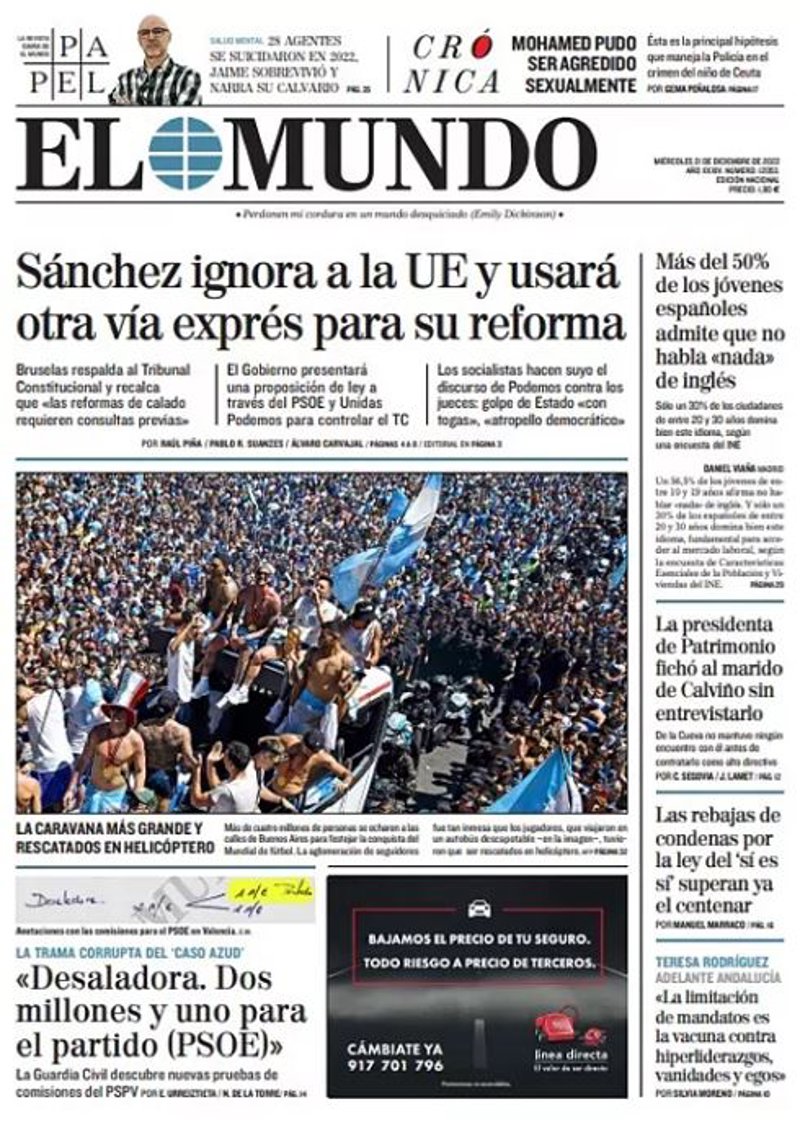 EL MUNDO: "Sánchez ignora a la UE y usará otra vía exprés para su reforma"; ""Desaladora. Dos millones y uno para el partido (PSOE)""; "Más del 50% de los jóvenes españoles admite que no habla "nada" de inglés"; "La presidenta de Patrimonio fichó al marido de Calviño sin entrevistarlo"; "Las rebajas de condenas por la ley del 'sí es sí' superan ya el centenar"; "Teresa Rodríguez: "La limitación de mandatos es la vacuna contra hiperliderazgos, vanidades y egos"".