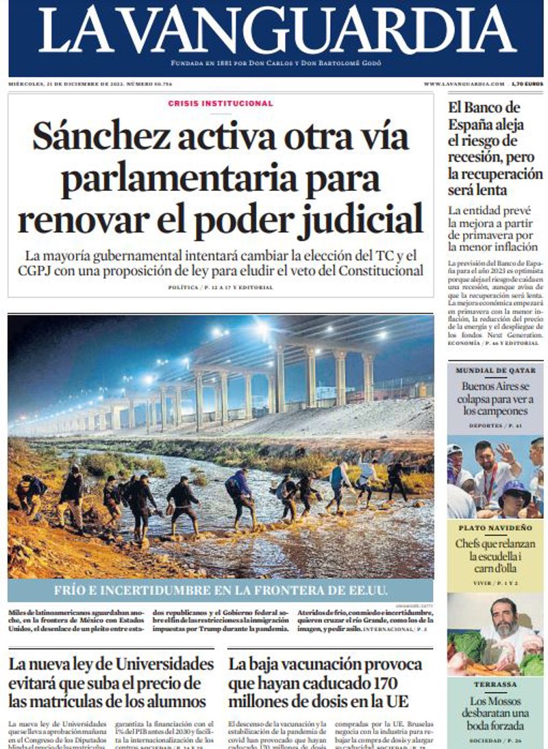 LA VANGUARDIA: "Sánchez activa otra vía parlamentaria para renovar el poder judicial"; "La nueva ley de Universidades evitará que suba el precio de las matrículas de los alumnos"; "La baja vacunación provoca que hayan caducado 170 millones de dosis en la UE"; "El Banco de España aleja el riesgo de la recesión, pero la recuperación será lenta".