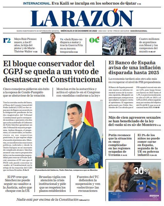 LA RAZÓN: "El bloque conservador del CGPJ se queda a un voto de desatascar el Constitucional"; "El Banco de España avisa de una inflación disparada hasta 2025"; "Más de cien agresores sexuales se han beneficiado de la ley del "solo sí es sí" de Montero"; "Putin reconoce que la situación es "muy complicada" en las regiones ocupadas de Ucrania"; "El 5% de los niños no puede comer carne en España, segunda de la UE en pobreza infantil".