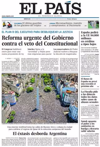 EL PAÍS: "Reforma urgente del Gobierno contra el veto del Constitucional"; "El éxtasis desborda Argentina"; "España pedirá a la UE 84.000 millones en créditos a tipos bajos"; "El Banco de España no prevé una recesión el próximo año"; "La Fiscalía pide a las diócesis todos los datos sobre casos de abusos sexuales"; "Sunak aguanta el pulso a los sanitarios en huelga y descarta subir salarios".