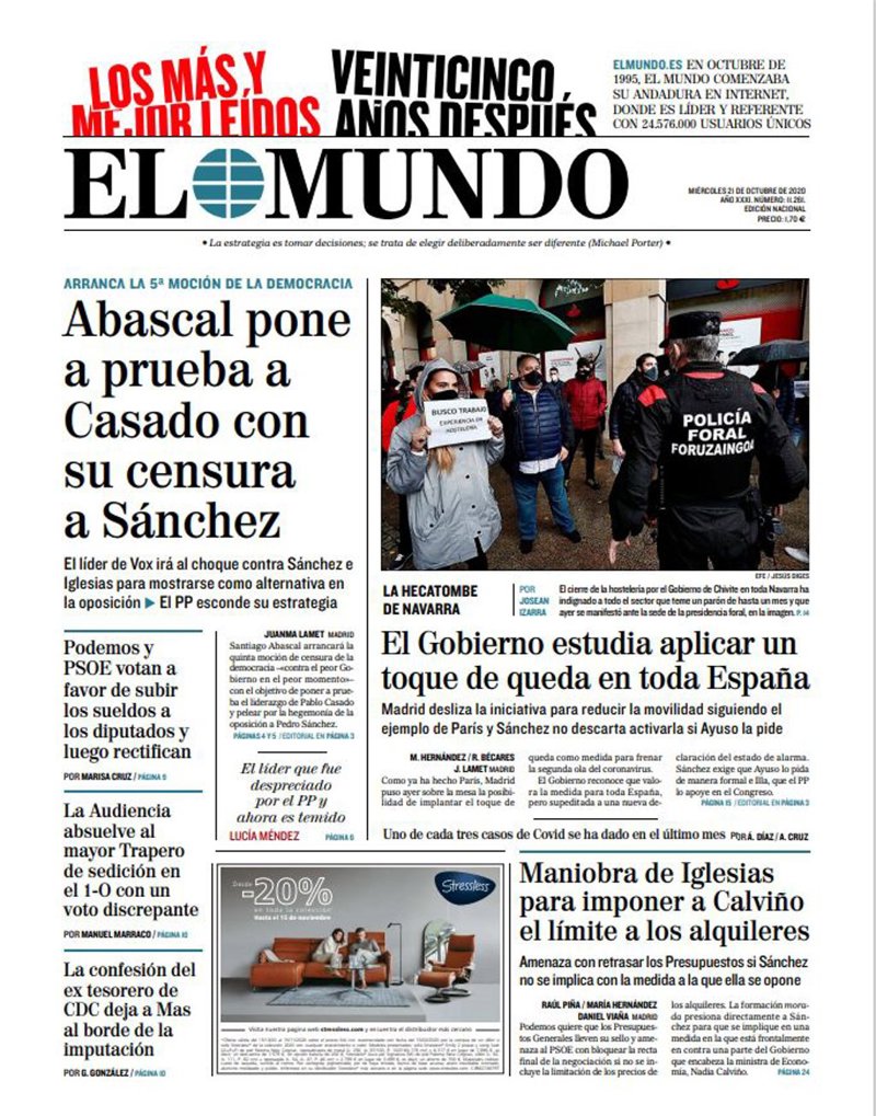 EL MUNDO: "Abascal pone a prueba a Casado con su censura a Sánchez"; "El Gobierno estudia aplicar un toque de queda en toda España. Uno de cada tres casos de Covid se ha dado en el último mes"; "Maniobra de Iglesias para imponer a Calviño el límite a los alquileres"; "Podemos y PSOE votan a favor de subir los sueldos a los diputados y luego rectifican"; "La Audiencia absuelve al mayor Trapero de sedición en el 1-O con un voto discrepante"; "La confesión del ex tesorero de CDC deja a Mas al borde de la imputación".