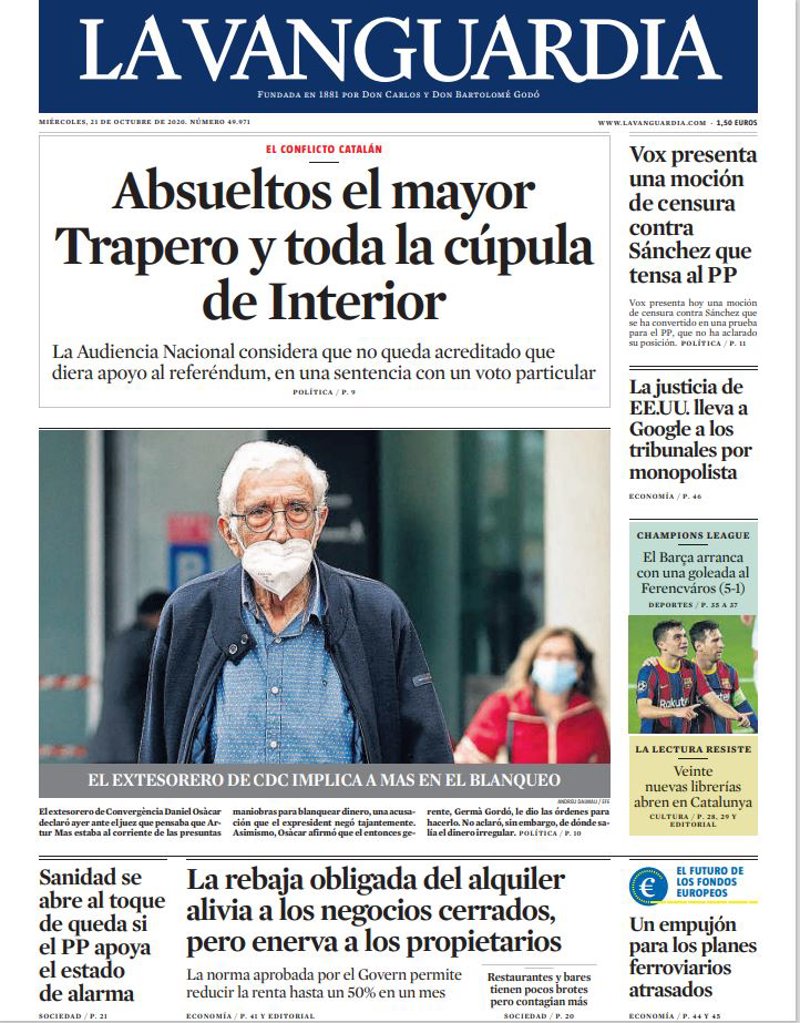 LA VANGUARDIA: "Absueltos el mayor Trapero y toda la cúpula de Interior"; "El extesorero de CDC implica a Mas en el blanqueo"; "La rebaja obligada del alquiler alivia a los negocios cerrados, pero enerva a los propietarios. Restaurantes y bares tienen pocos brotes pero contagian más"; "Vox presenta una moción de censura contra Sánchez que tensa al PP"; "La justicia de EE.UU. lleva a Google a los tribunales por