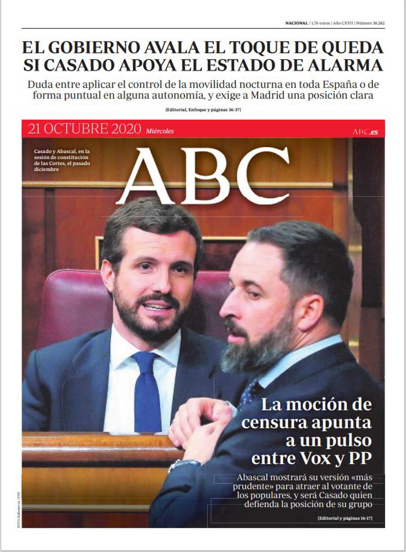 ABC: "La moción de censura apunta a un pulso entre Vox y PP. Abascal mostrará su versión "más prudente" para atraer al votante de los populares, y será Casado quien defienda la posición de su grupo"; "El Gobierno avala el toque de queda si Casado apoya el estado de alarma. Duda entre aplicar el control de la movilidad nocturna en toda España o de forma puntual en alguna autonomía, y exige a Madrid una posición clara".