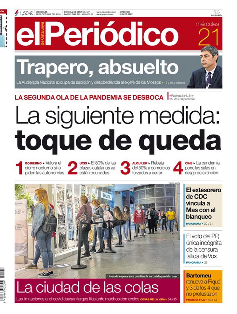 EL PERIÓDICO: "Trapero, absuelto. La Audiencia Nacional exculpa de sedición y desobediencia al exjefe de los Mossos"; "La siguiente medida: toque de queda. La segunda ola de la pandemia se desboca"; "La ciudad de las colas. Las limitaciones anti-covid causan largas filas ante muchos comercios"; "El extesorero de CDC vincula a Mas con el blanqueo"; "El voto del PP, única incógnita de la censura fallida de Vox".