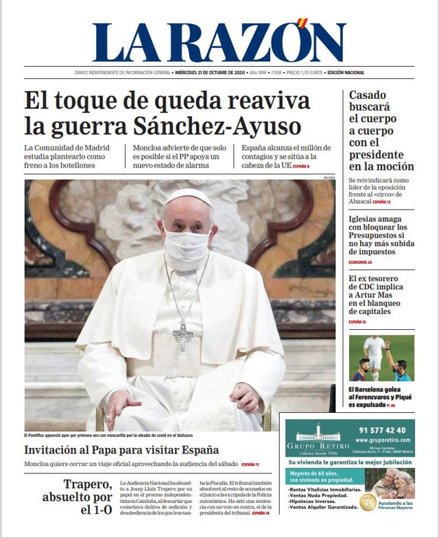 LA RAZÓN: "El toque de queda reaviva la guerra Sánchez-Ayuso"; "Invitación al Papa para visitar España"; "Trapero, absuelto por el 1-O"; "Casado buscará el cuerpo a cuerpo con el presidente en la moción"; "Iglesias amaga con bloquear los Presupuestos si no hay más subida de impuestos"; "El ex tesorero de CDC implica a Artur Mas en el blanqueo de capitales".