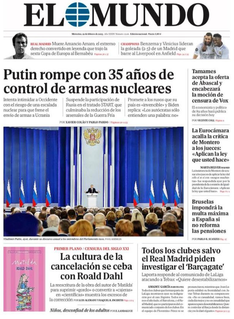 EL MUNDO: "Putin rompe con 35 años de control de armas nucleares"; "La cultura de la canción se ceba con Roald Dahl"; "Tamames acepta la oferta de Abascal y encabezará la moción de censura"; "La Eurocámara acalla la crítica de Montero a los jueces: "Aplican la ley que usted hace""; "Bruselas impondrá la multa máxima a España si no reforma las pensiones"; "Todos los clubes salvo el Real Madrid piden investigar al 'Barçagate'".