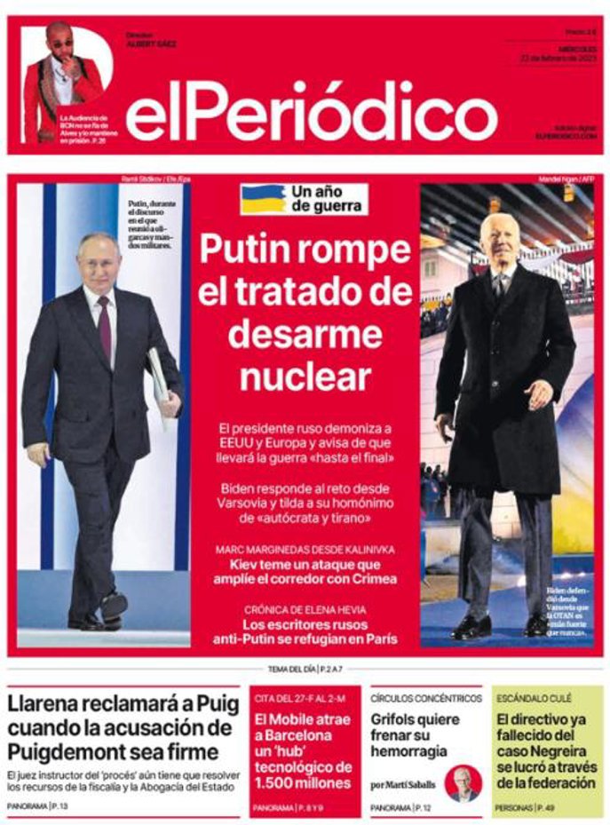 EL PERIÓDICO: "Putin rompe el tratado de desarme nuclear"; "Llarena reclamará a Puig cando la acusación de Puigdemont sea firme"; "El Mobile atrae a Barcelona un 'hub' tecnológico de 1.500 millones"; "Grifols quiere frenar su hemorragia"; "El directivo ya fallecido del caso Negreira se lucró a través de la federación".