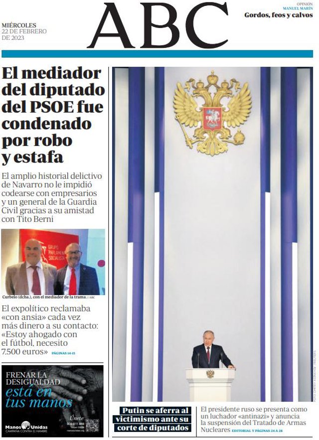 ABC: "El mediador del diputado del PSOE fue condenado por robo y estafa"; "Putin se aferra al victimismo ante su corte de diputados".