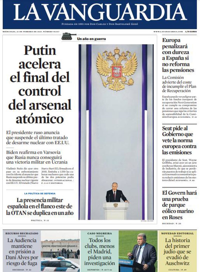 LA VANGUARDIA: "Putin acelera el final del control del arsenal atómico"; "La presencia militar española en el flanco este de la OTAN se duplica en un año"; "Europa penalizará con dureza a España si no reforma las pensiones"; "Seat pide al Gobierno que vete la norma europea contra las emisiones"; "El Govern hará una prueba de parque eólico marino en Roses".
