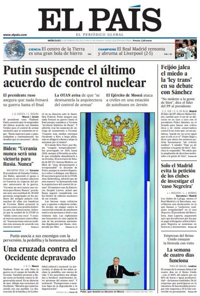EL PAÍS: "Putin suspende el último acuerdo de control nuclear"; "Una cruzada contra el Occidente depravado"; "Feijóo jalea el miedo a la 'ley trans' en su debate con Sánchez"; "Solo el Madrid evita la petición de los clubes de investigar el 'caso Negreira'"; "La semana de cuatro días funciona".