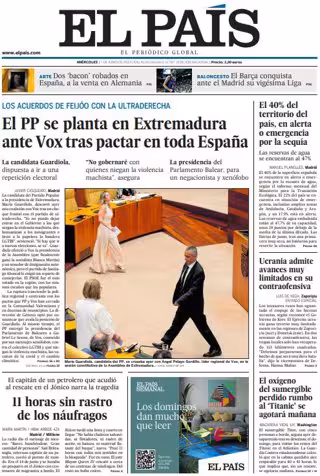 EL PAÍS: "El PP se planta en Extremadura ante Vox tras pactar en toda España"; "11 horas sin rastro de los náufragos"; "El 40% del territorio del país, en alerta o emergencia por la sequía"; "Ucrania admite avances muy limitados en su contraofensiva"; "El oxígeno del sumergible perdido rumbo al 'Titanic' se agotará mañana".